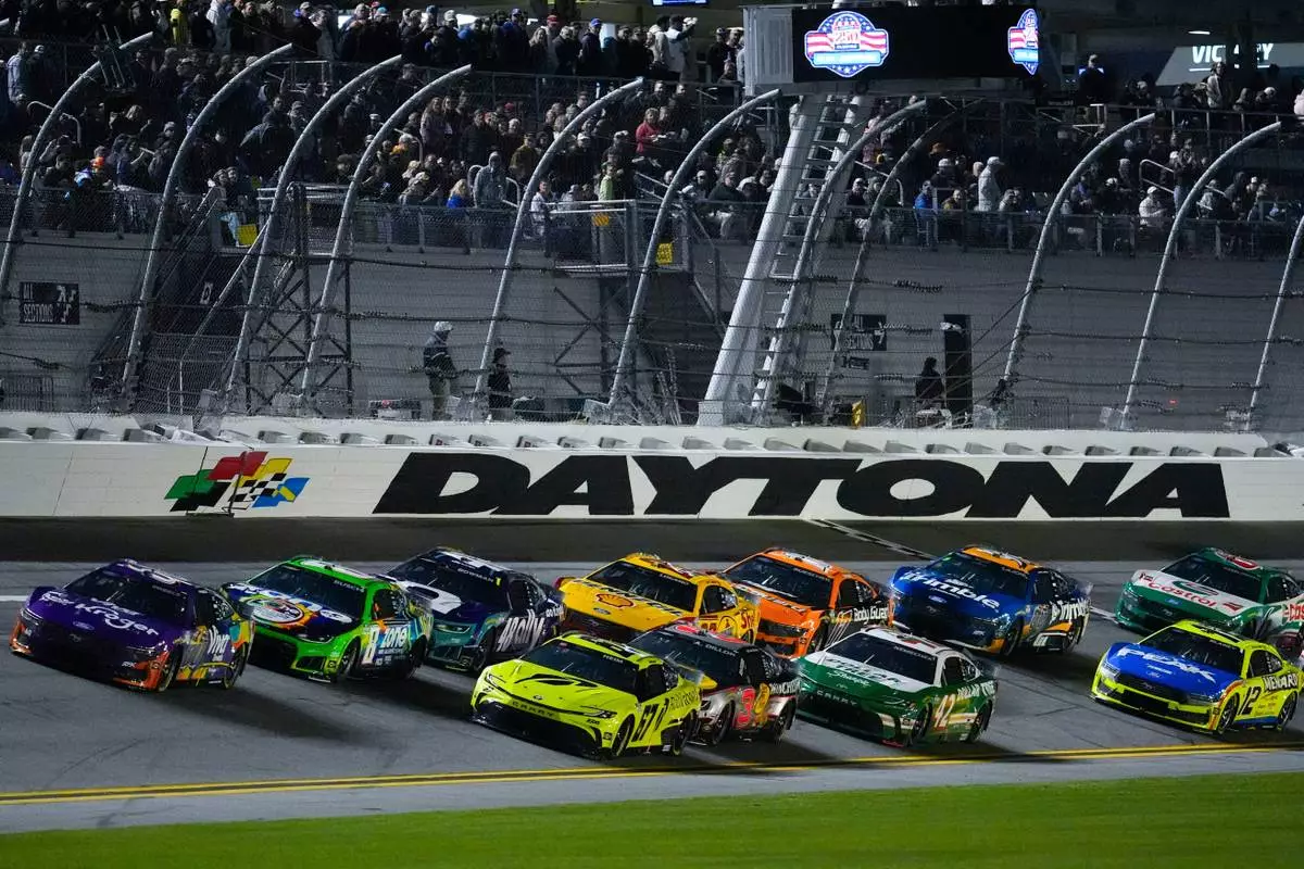 Cars runs during the first of two NASCAR Daytona 500 qualifying auto races at Daytona International Speedway, Thursday, Feb. 12, 2026, in Daytona Beach, Fla. (AP Photo/Mike Stewart)