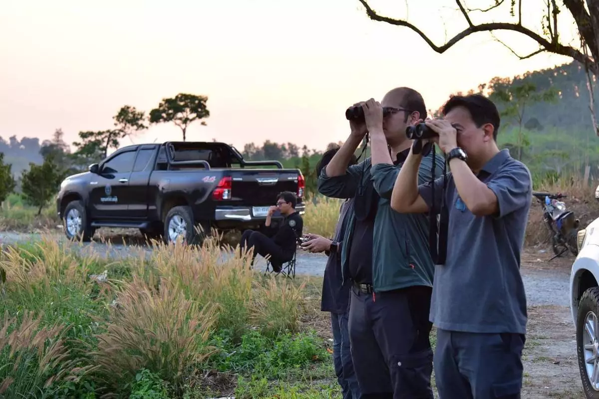In this photo released by Thailand Department of National Parks, Wildlife and Plant Conservation, officials use a pair of binoculars to monitor wild elephants after they received elephant contraception vaccines in the Trat province of Thailand, Tuesday, Jan. 27, 2026. (Thailand Department of National Parks, Wildlife and Plant Conservation via AP)