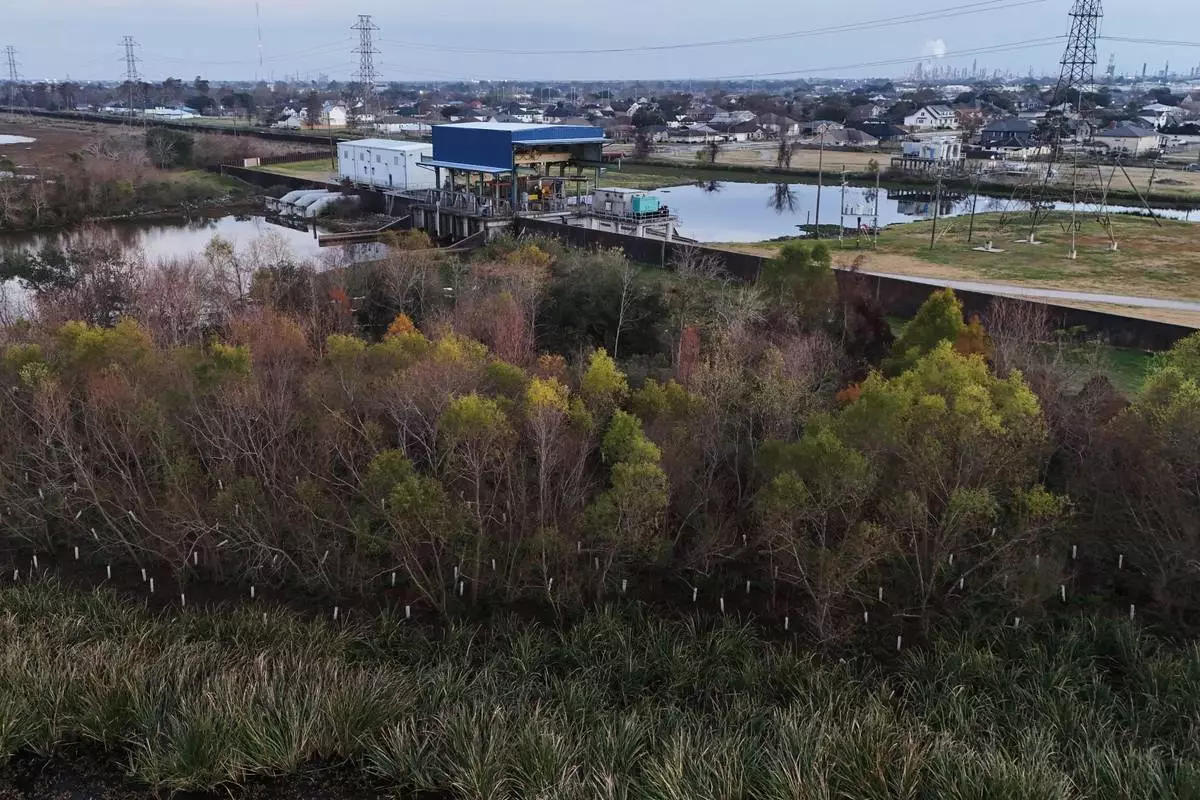 MERAUX, La. (AP) — Across the calm waters behind a pumping station near Lake Borgne, hundreds of saplings stand out in the mist, wrapped in white plastic cylinders.