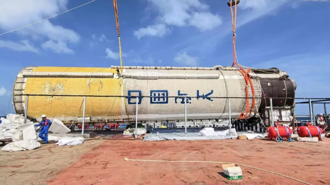 The first stage of the Long March-10 carrier rocket used in a flight test for China's crewed lunar exploration in future has been successfully fished out and retrieved from the sea, marking China's completion of its first-ever rocket first-stage booster maritime salvage and recovery mission.