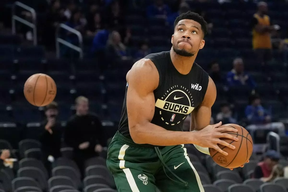 FILE - Milwaukee Bucks forward Giannis Antetokounmpo warms up before an NBA basketball game against the Golden State Warriors in San Francisco, Jan. 7, 2026. (AP Photo/Jeff Chiu, File)