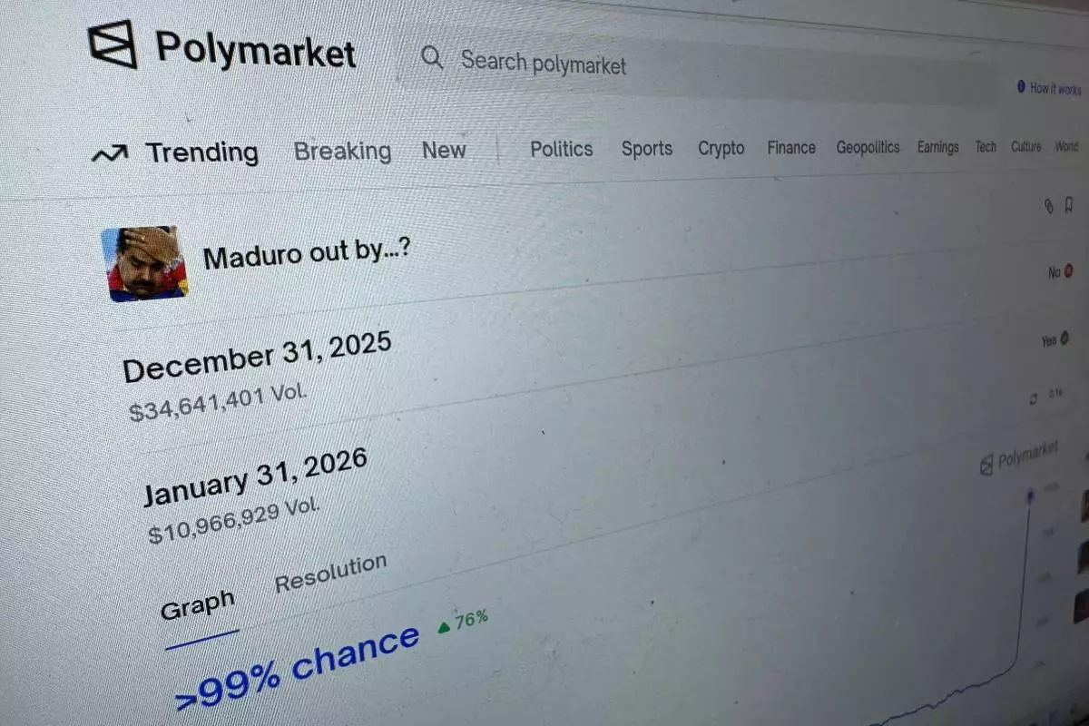 FILE - The Polymarket prediction market website is displayed on a computer screen, Jan. 11, 2026, in New York. (AP Photo/Wyatte Grantham-Philips, File)