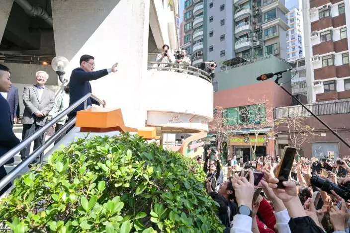 The Chief Executive, Mr John Lee, visited Yau Ma Tei today (February 13). Photo shows Mr Lee (right) visiting Yau Ma Tei and interacting with the public. Source: HKSAR Government Press Releases
