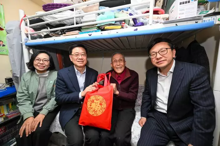 The Chief Executive, Mr John Lee, visited Yau Ma Tei today (February 13). Photo shows Mr Lee (second left), accompanied by the Secretary for Home and Youth Affairs, Miss Alice Mak (first left), and the Secretary for Labour and Welfare, Mr Chris Sun (first right), visiting a singleton elderly person living in Prosperous Garden, Yau Ma Tei. Source: HKSAR Government Press Releases