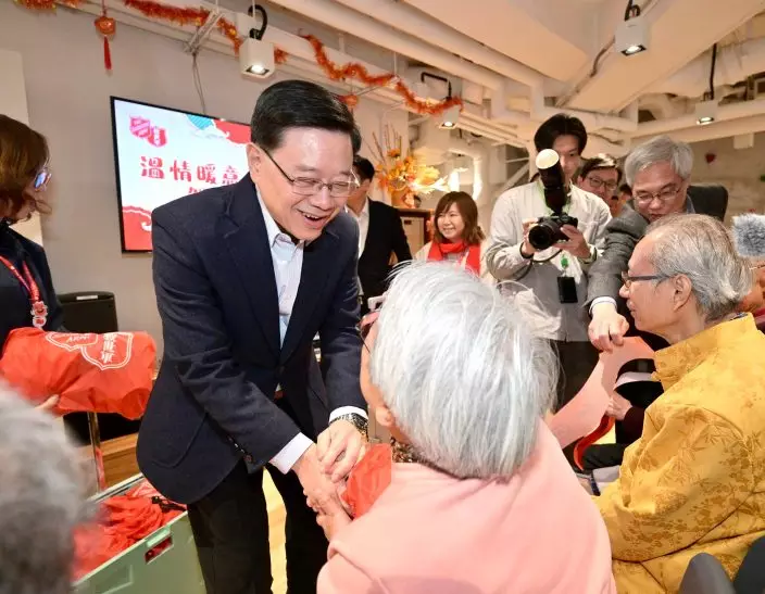 The Chief Executive, Mr John Lee; the Secretary for Home and Youth Affairs, Miss Alice Mak; and the Secretary for Labour and Welfare, Mr Chris Sun, accompanied by the Director of Home Affairs, Ms Priscilla To, and the District Officer (Yau Tsim Mong), Mr Eric Lee, visited two elderly families living in Prosperous Garden today to understand their daily lives andpresent them with Chinese New Year blessing bags. Mr Lee, Miss Mak and Mr Sun, together with a District Council (DC) member, an Area Committee member and a representative from the District Services and Community Care Team (Care Team) of Yau Tsim Mong District, also visited the Salvation Army Yaumatei Multi-service Centre for Senior Citizens to send seasonal greetings to members of the public and wish them a healthy and happy Year of the Horse.