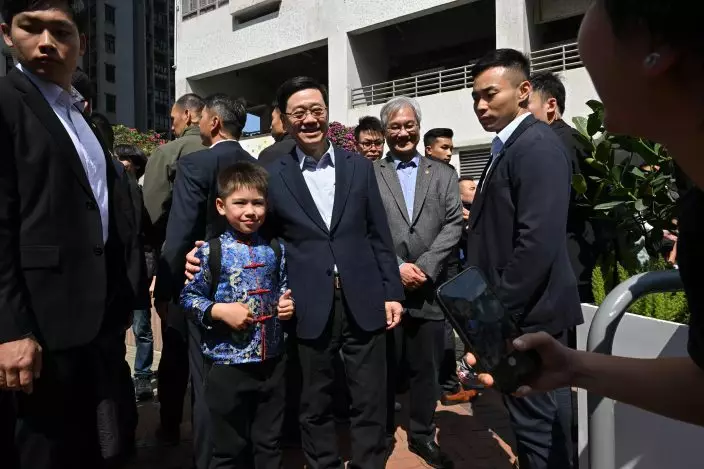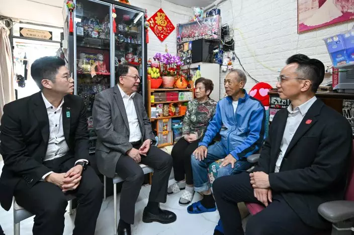The Chief Executive, Mr John Lee, visited Yau Ma Tei today (February 13). Photo shows Mr Lee (first right) visiting residents living in Prosperous Garden, Yau Ma Tei. Source: HKSAR Government Press Releases