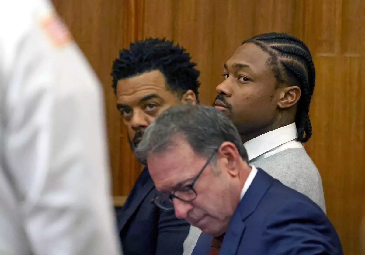 New England Patriots' Stefon Diggs, right, appears for his arraignment on felony strangulation and a misdemeanor assault charges, Friday, Feb. 13, 2026, at District Court in Dedham, Mass. (David L. Ryan/The Boston Globe via AP, Pool)
