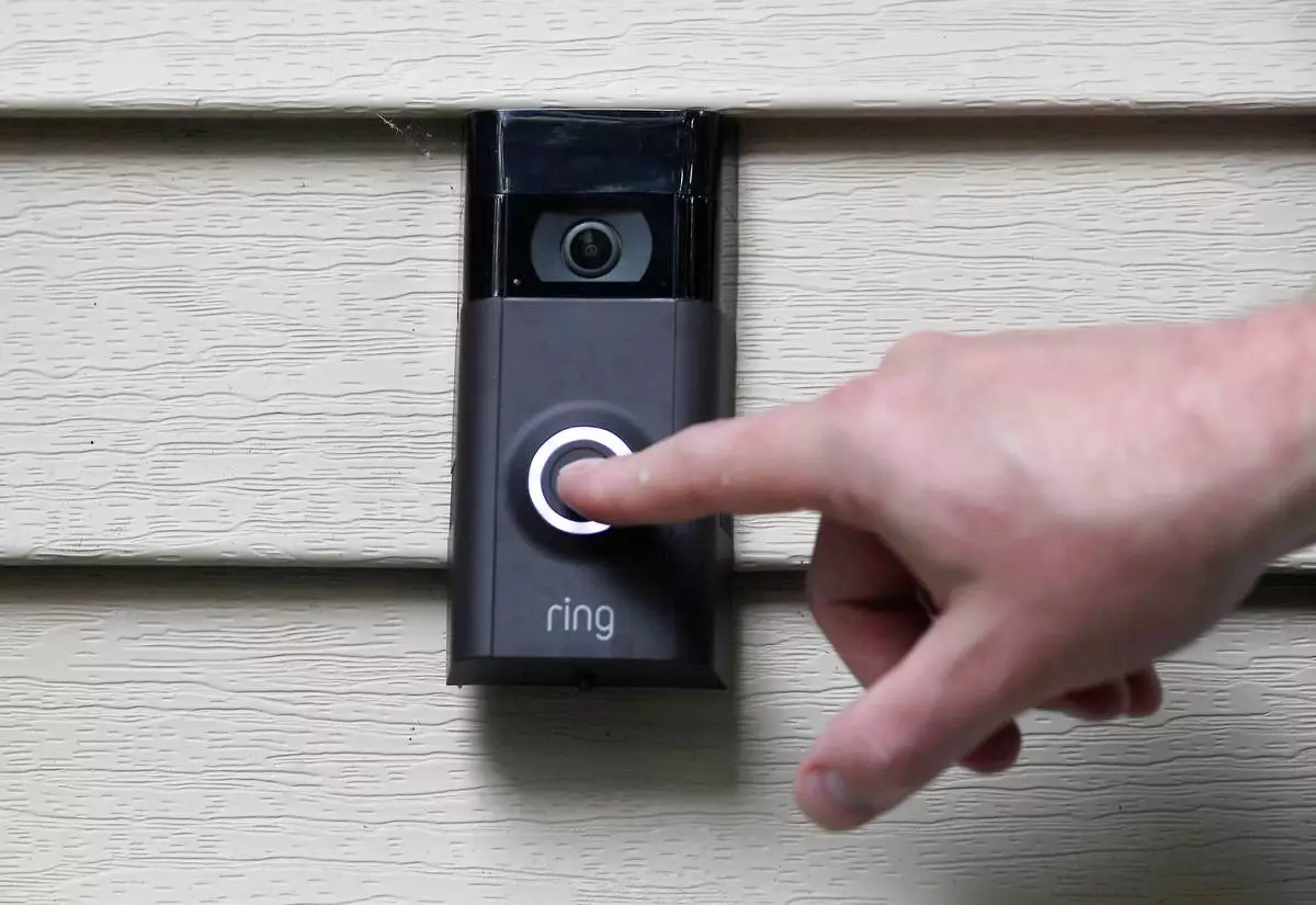 FILE - A person pushes the doorbell on their Ring doorbell camera, July 16, 2019, in Wolcott, Conn. (AP Photo/Jessica Hill, File)