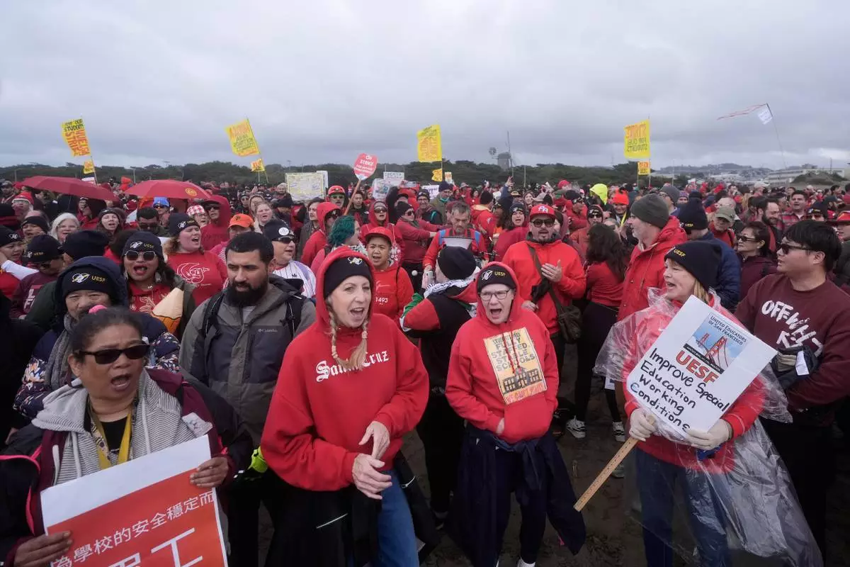 Teachers, students and supporters rally in support of the ongoing teacher's strike at the San Francisco Unified School District at Ocean Beach, in San Francisco, Wednesday, Feb. 11, 2026. (AP Photo/Jeff Chiu)