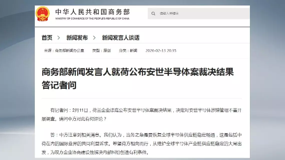 China's Ministry of Commerce on Friday urged efforts to restore the smooth, stable operation of the global semiconductor supply chain, after a Dutch court announced a ruling related to semiconductor manufacturer Nexperia.
