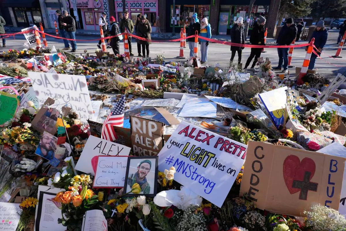 People visit a makeshift memorial for 37-year-old Alex Pretti, who was fatally shot by a U.S. Border Patrol officer last week, on Saturday, Jan. 31, 2026, in Minneapolis. (AP Photo/Ryan Murphy)