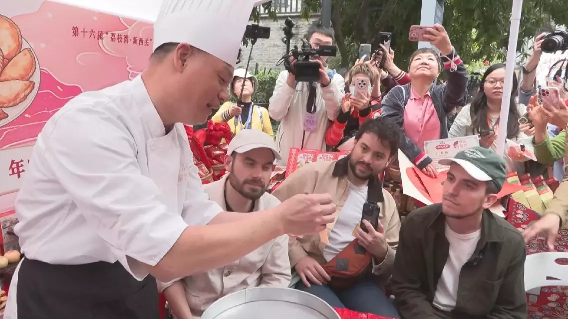 At Yongqingfang, a historic district in the city's Liwan District, French visitor Jules tried his hand at making dansan, a classic Cantonese New Year snack, drawing a curious crowd of local onlookers.