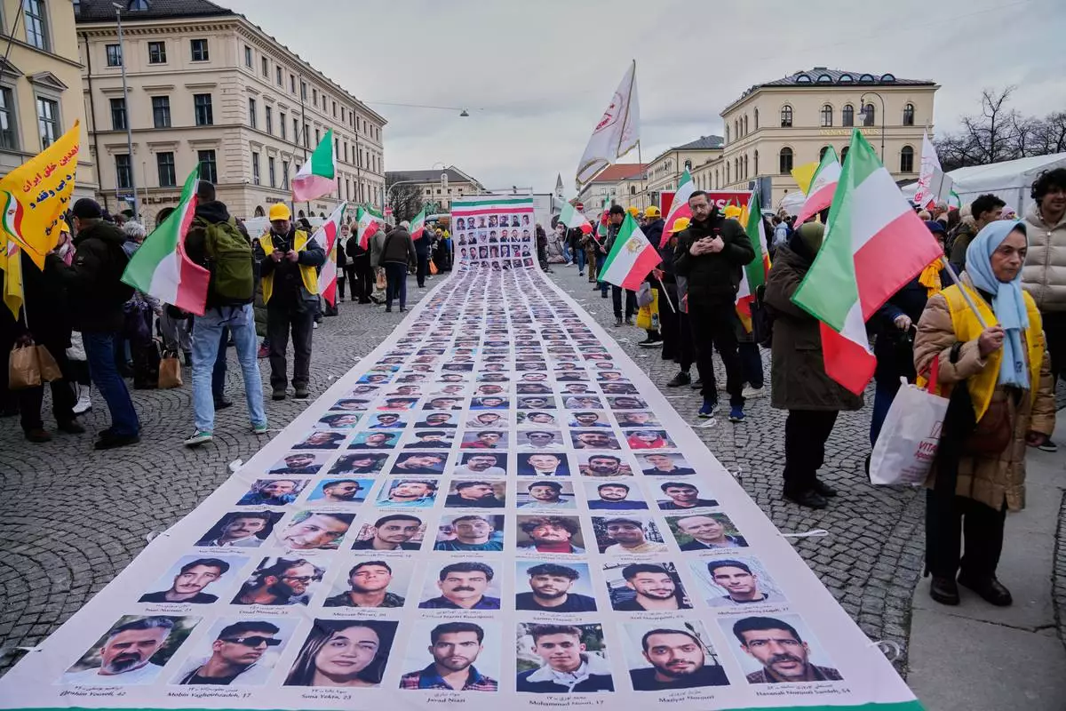 Supporters of the Iranian opposition organisation People's Mujahedeen Organisation of Iran, PMOI, also known as the Mujahedeen-e-Khalq, MEK, show posters of people, they said was killed during the protests in Iran, at a demonstration during the Munich Security Conference in Munich, Germany, Friday, Feb. 13, 2026. (AP Photo/Ebrahim Noroozi)