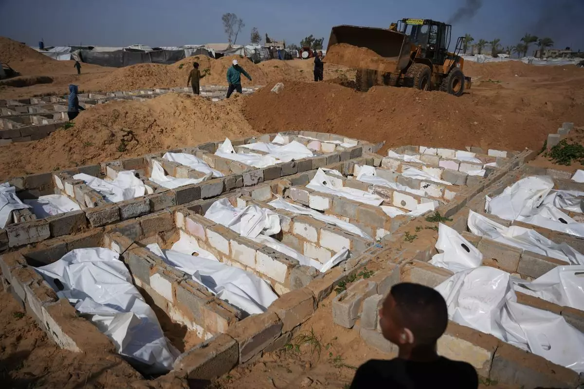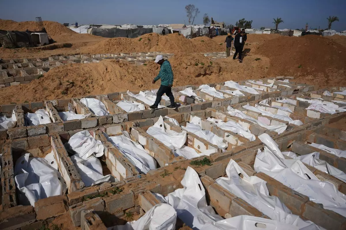 Bodies of unidentified Palestinians returned from Israel as part of the ceasefire deal are buried in Deir al-Balah, Gaza Strip, Friday, Feb. 13, 2026. (AP Photo/Abdel Kareem Hana)