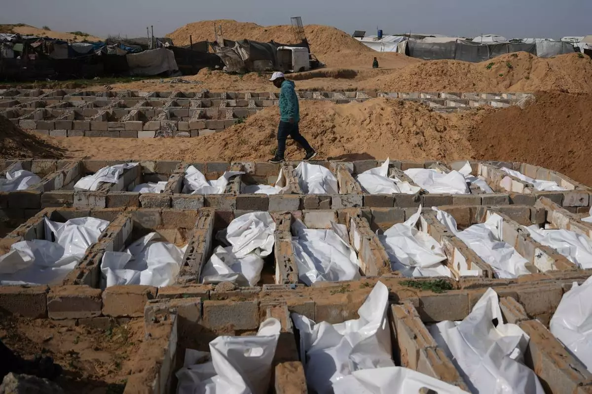 A man walks past graves containing the bodies of unidentified Palestinians returned from Israel as part of the ceasefire deal during their burial in Deir al-Balah, Gaza Strip, Friday, Feb. 13, 2026. (AP Photo/Abdel Kareem Hana)