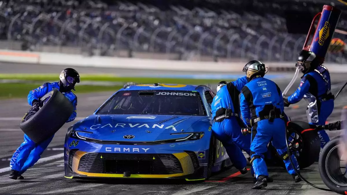 Jimmie Johnson's pit crew works during the first of two NASCAR Daytona 500 qualifying auto races at Daytona International Speedway, Thursday, Feb. 12, 2026, in Daytona Beach, Fla. (AP Photo/Mike Stewart)
