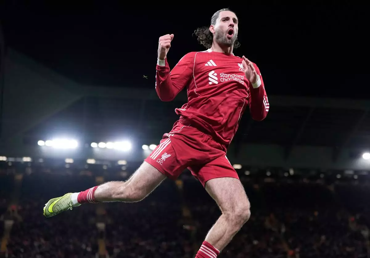 Liverpool's Dominik Szoboszlai jumps up as he celebrates after scoring his sides second goal during the English FA Cup fourth round soccer match between Liverpool and Brighton and Hove Albion in Liverpool, England, Saturday, Feb. 14, 2026. (Peter Byrne/PA via AP)