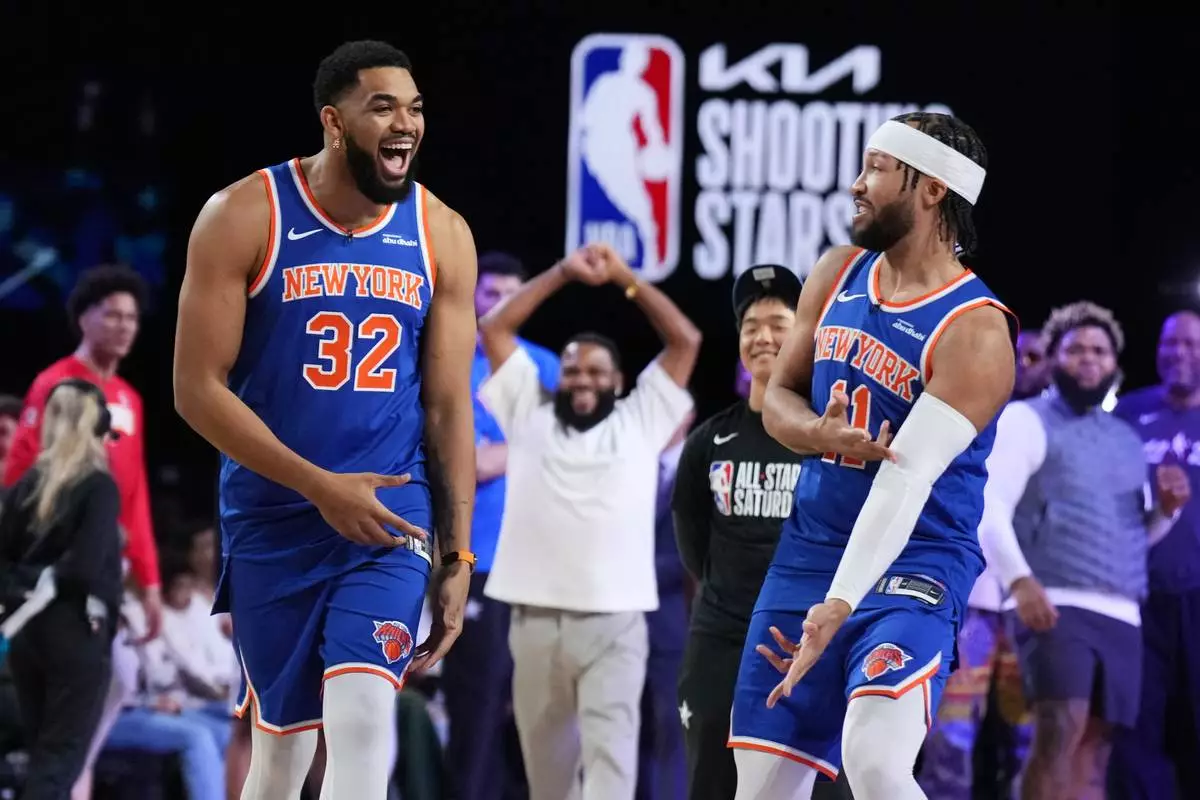 New York Knicks forward Karl-Anthony Towns and guard Jalen Brunson celebrate during the shooting stars competition at the NBA basketball All-Star weekend festivities Saturday, Feb. 14, 2026, in Inglewood, Calif. (AP Photo/Jae C. Hong)