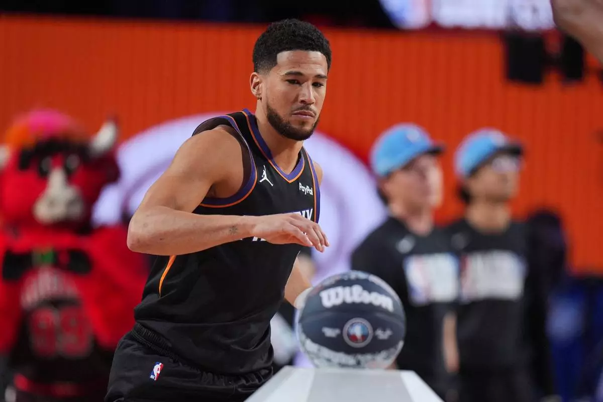 Phoenix Suns guard Devin Booker reaches for the ball during the 3-point contest at the NBA basketball All-Star weekend festivities Saturday, Feb. 14, 2026, in Inglewood, Calif. (AP Photo/Jae C. Hong)