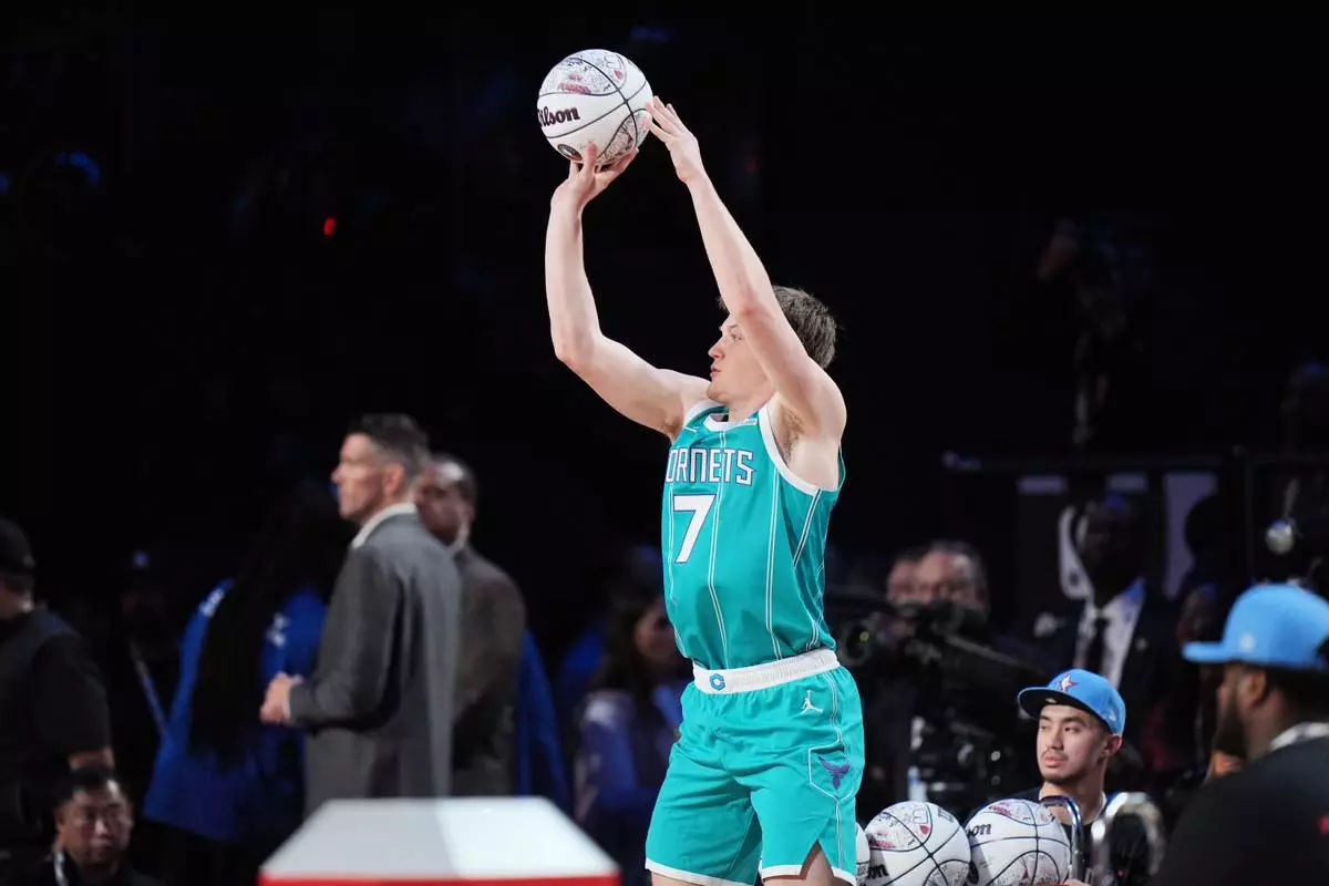 Charlotte Hornets guard Kon Knueppel shoots during the 3-point contest at the NBA basketball All-Star weekend festivities Saturday, Feb. 14, 2026, in Inglewood, Calif. (AP Photo/Jae C. Hong)