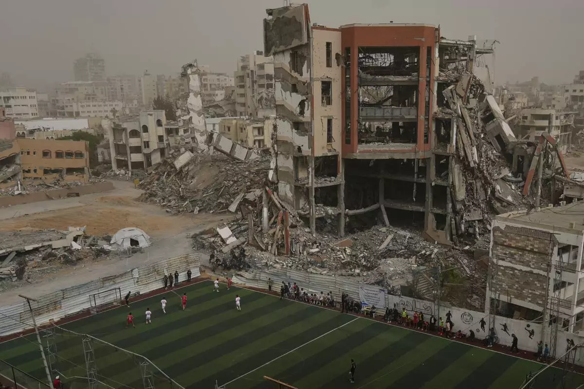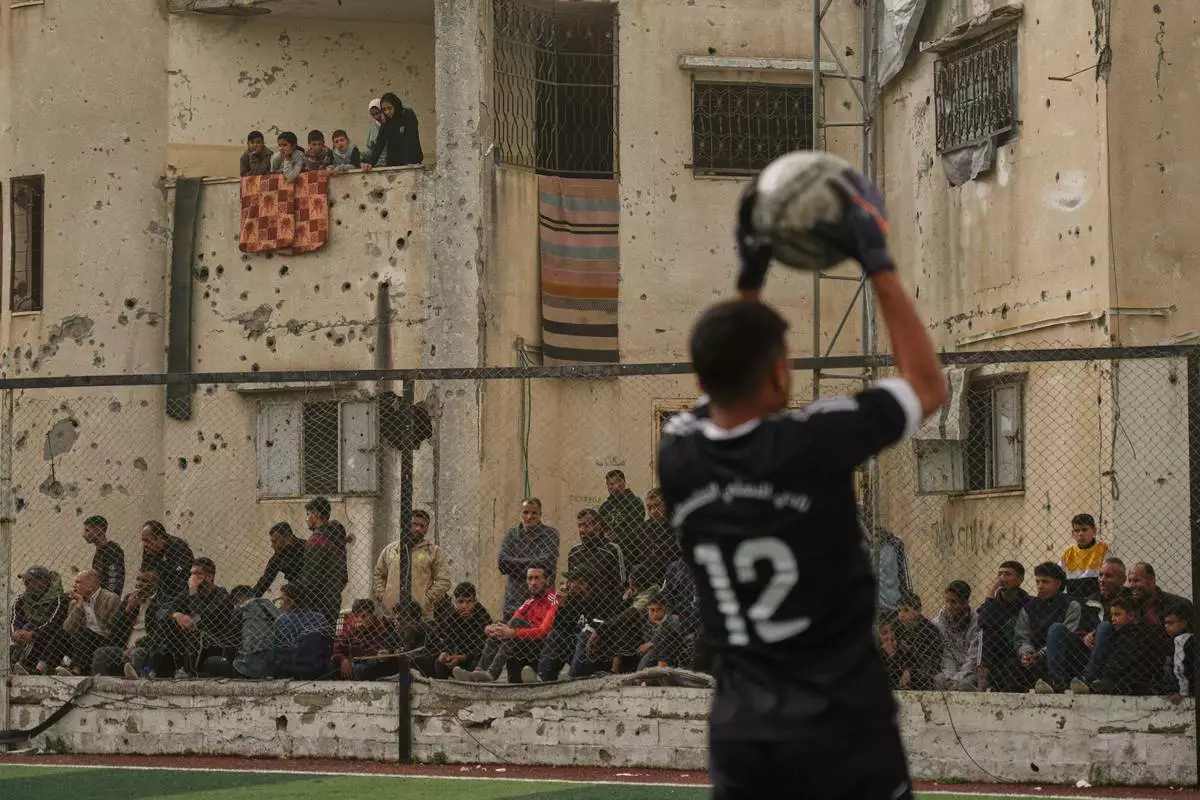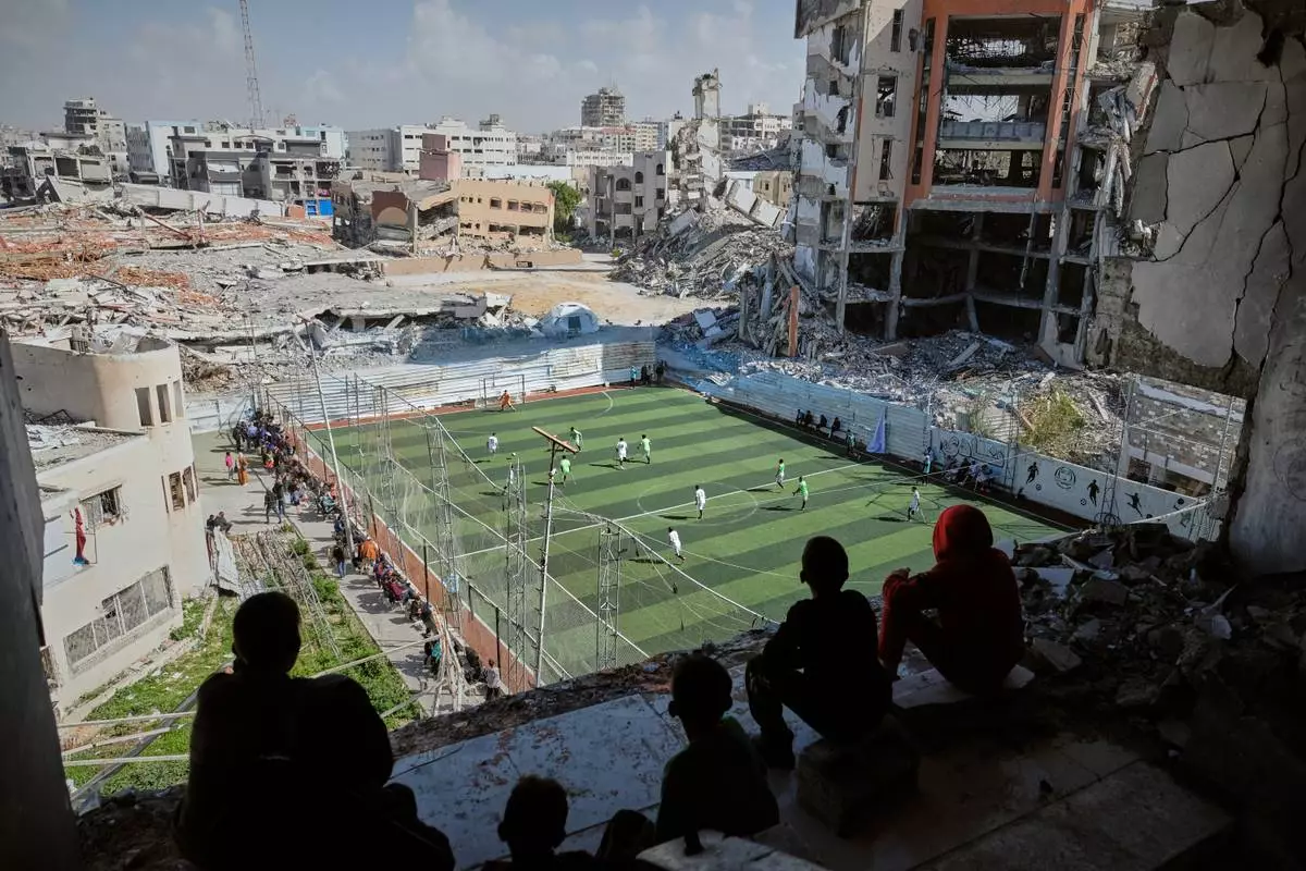 Palestinians watch a soccer match between Al-Ahly Club and Gaza Sports Club at a newly constructed field surrounded by buildings destroyed in Israeli ground and air operations, in Gaza City, Saturday, Feb. 14, 2026. (AP Photo/Jehad Alshrafi)