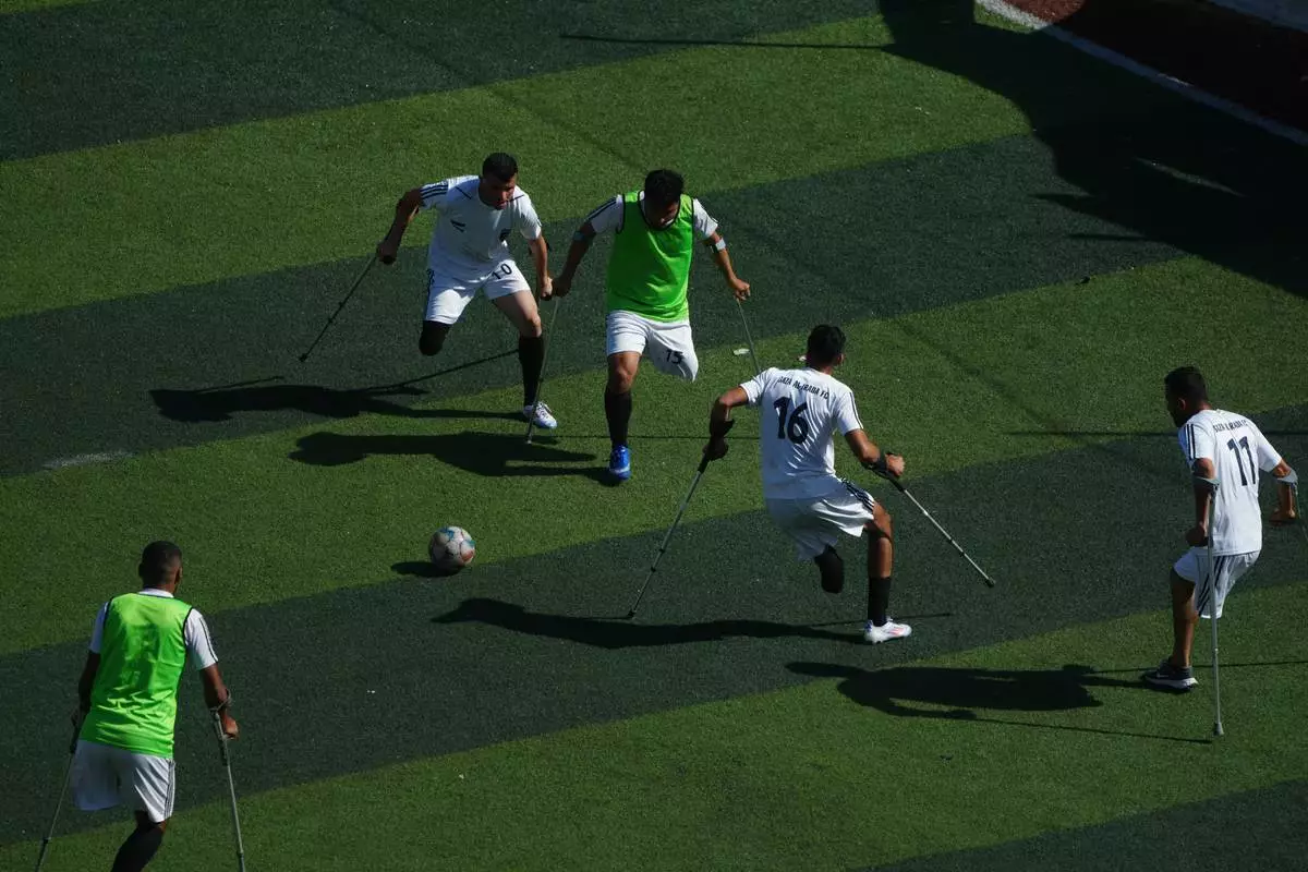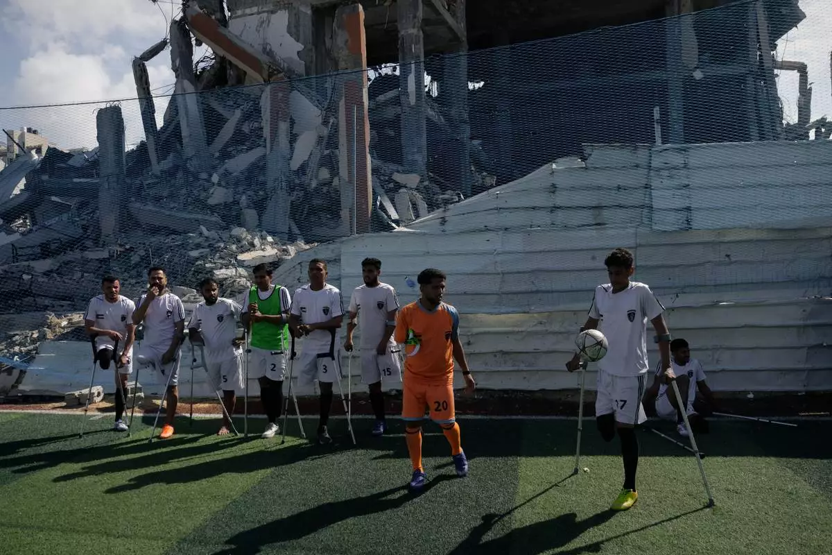 Palestinian amputee soccer players train on a newly built field surrounded by buildings destroyed in Israeli army bombardments during the Israel-Hamas war, in Gaza City, Wednesday, Feb. 11, 2026. (AP Photo/Jehad Alshrafi)