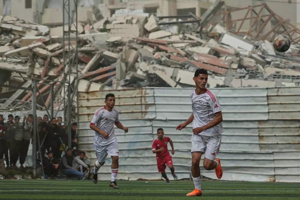 Palestinian players of Gaza Sports Club and Al-Ahly Club take part in a soccer match at a newly constructed field surrounded by buildings destroyed in Israeli ground and air operations, in Gaza City, Saturday, Feb. 14, 2026. (AP Photo/Jehad Alshrafi)
