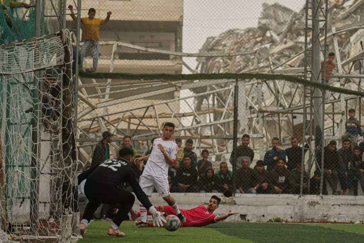 A Palestinian goalkeeper of Al-Ahly Club saves a shot by Gaza Sports Club's player, center, during a soccer match at a newly constructed field surrounded by buildings destroyed in Israeli ground and air operations, in Gaza City, Saturday, Feb. 14, 2026. (AP Photo/Jehad Alshrafi)