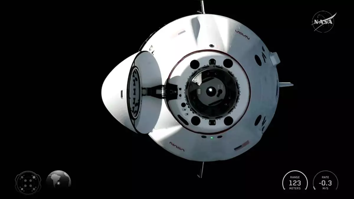 In this image from video provided by NASA, a SpaceX Dragon capsule carrying Americans Meir and Jack Hathaway, France’s Sophie Adenot and Russia’s Andrei Fedyaev, approaches the International Space Station for docking on Saturday, Feb. 14, 2026. (NASA via AP)