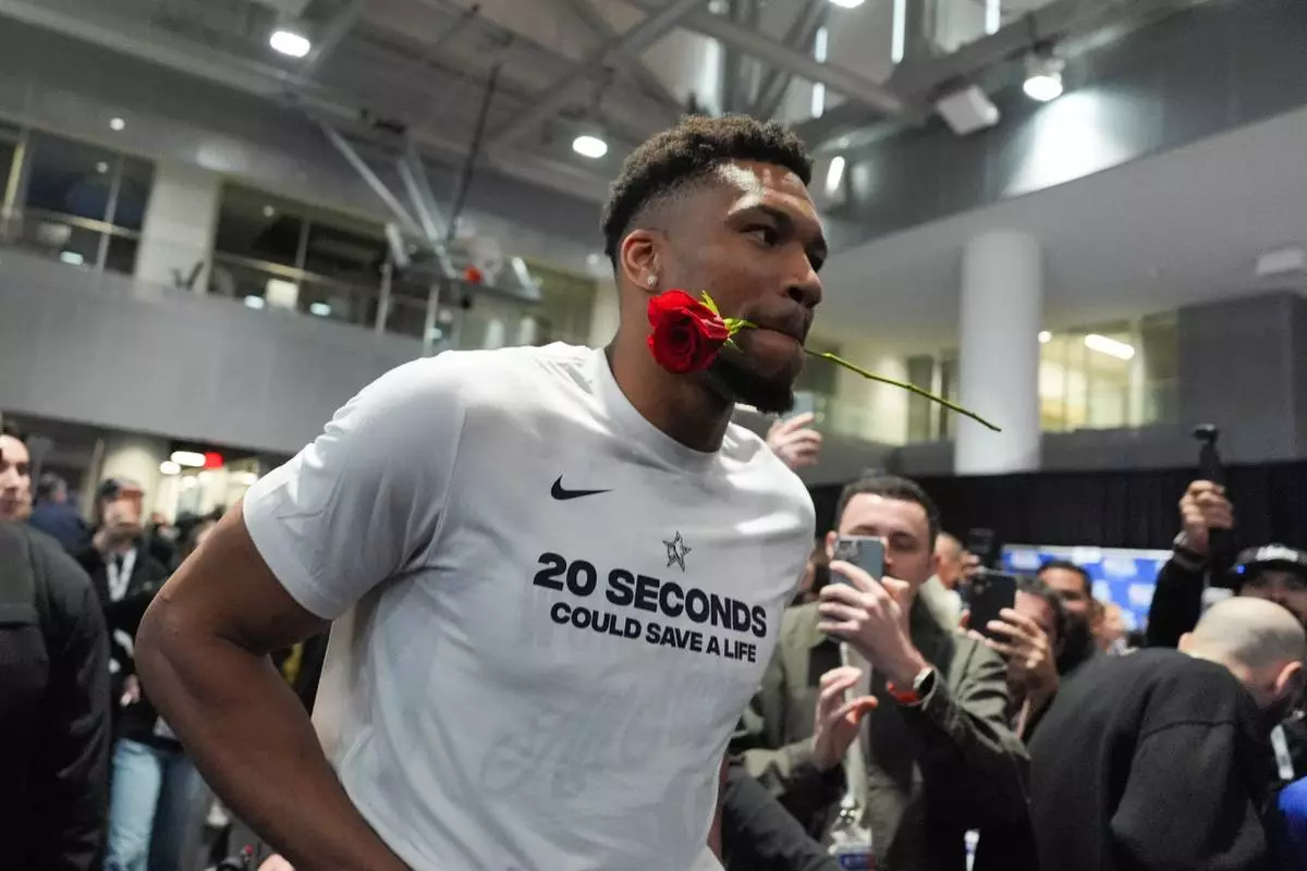 Milwaukee Bucks' Giannis Antetokounmpo walks with a rose in his mouth during the NBA All-Star basketball game media day Saturday, Feb. 14, 2026, in Inglewood, Calif. (AP Photo/Jae C. Hong)