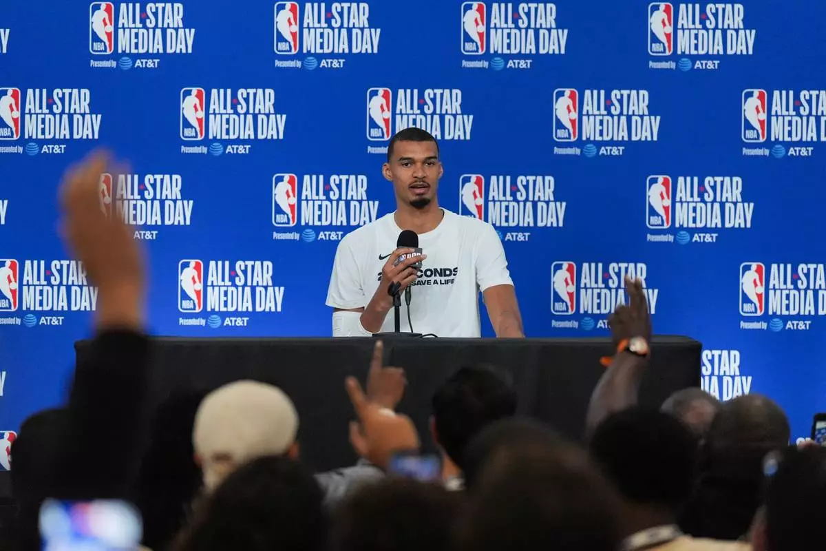 San Antonio Spurs' Victor Wembanyama talks to reporters during the NBA All-Star basketball game media day Saturday, Feb. 14, 2026, in Inglewood, Calif. (AP Photo/Jae C. Hong)