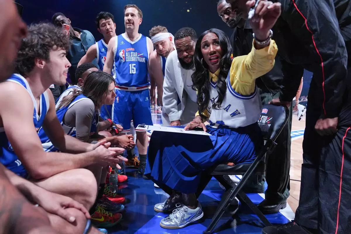Former WNBA star Lisa Leslie, second from right, talks to players during an NBA basketball's All-Star Celebrity Game Friday, Feb. 13, 2026, in Inglewood, Calif. (AP Photo/Jae C. Hong)