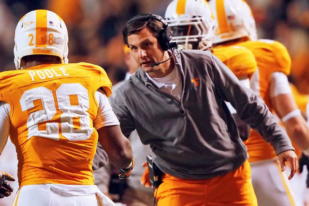 FILE - Tennessee head coach Derek Dooley, right, congratulates Tauren Poole (28) after he scored in the first quarter of an NCAA college football game against Middle Tennessee, Nov. 5, 2011, in Knoxville, Tenn. (AP Photo/Wade Payne, File)