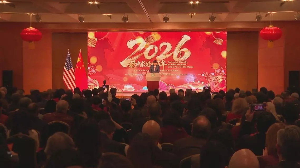 The reception hosted by the Chinese Embassy in the United States on Feb 10 in Washington presented performances such as lion dance and displayed a promotional video of China Media Group (CMG) 2026 Spring Festival Gala.
