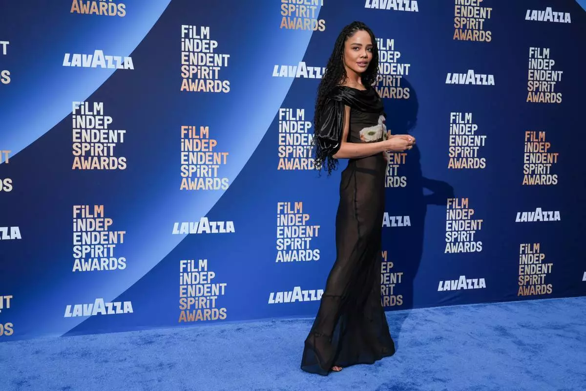 Tessa Thompson arrives at the Film Independent Spirit Awards on Sunday, Feb. 15, 2026, at the Hollywood Palladium in Los Angeles. (Photo by Jordan Strauss/Invision/AP)