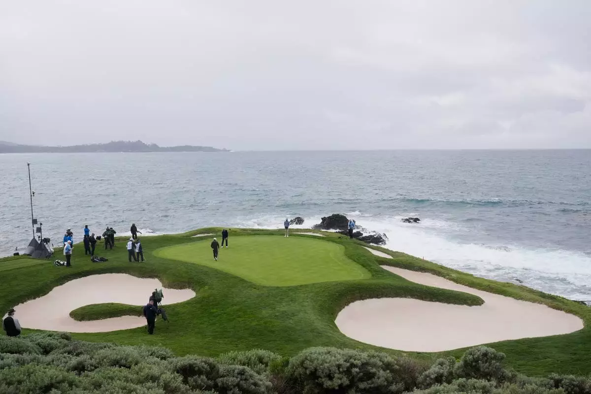 Min Woo Lee, from Australia, hits from the 18th fairway at Pebble Beach Golf Links during the final round of the AT&T Pebble Beach Pro-Am golf tournament in Pebble Beach, Calif., Sunday, Feb. 15, 2026. (AP Photo/Godofredo A. Vásquez)