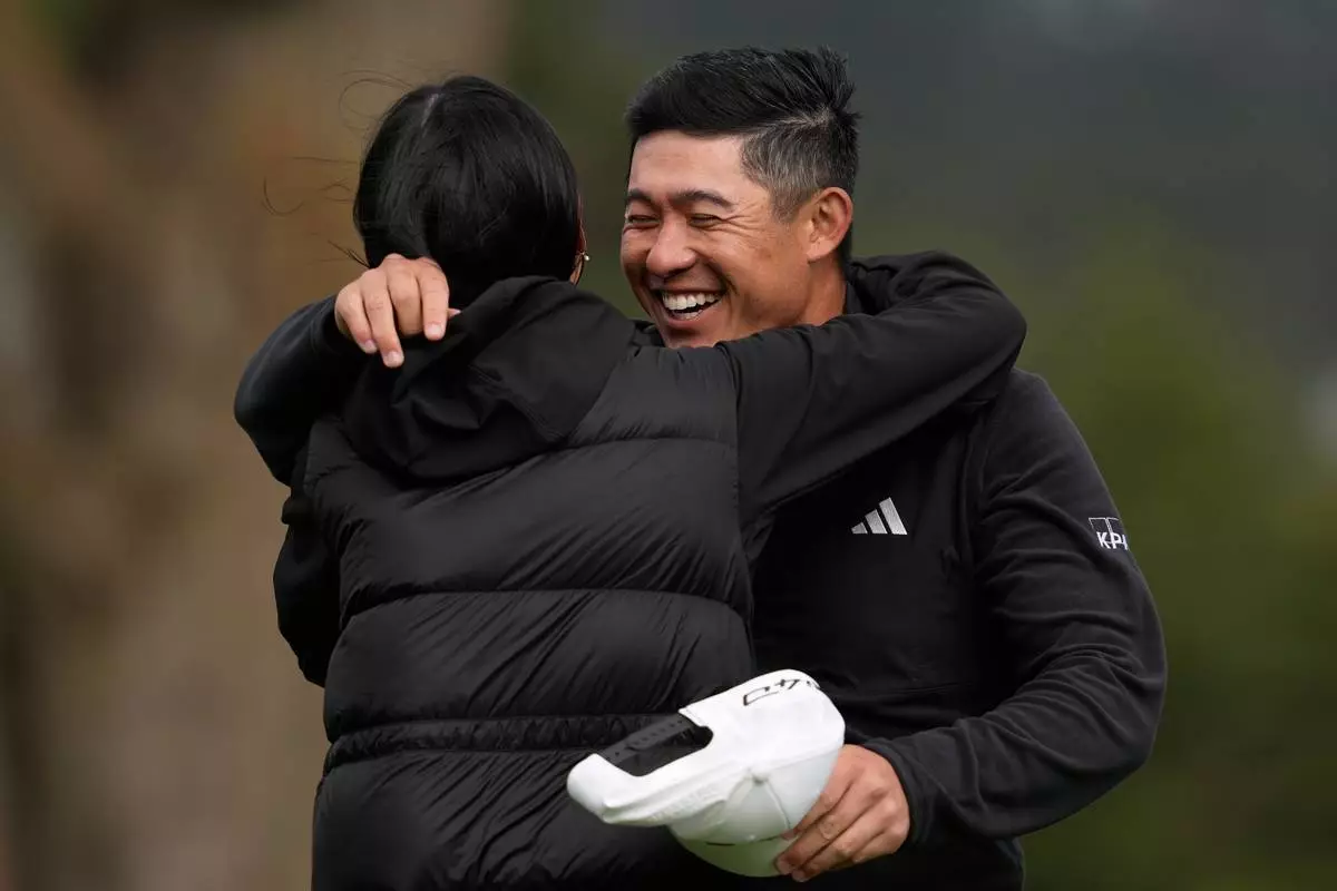 Collin Morikawa, right, celebrates with his wife, Katherine Zhu, after making a birdie putt on the 18th hole at Pebble Beach Golf Links during the final round to win the AT&T Pebble Beach Pro-Am golf tournament in Pebble Beach, Calif., Sunday, Feb. 15, 2026. (AP Photo/Godofredo A. Vásquez)