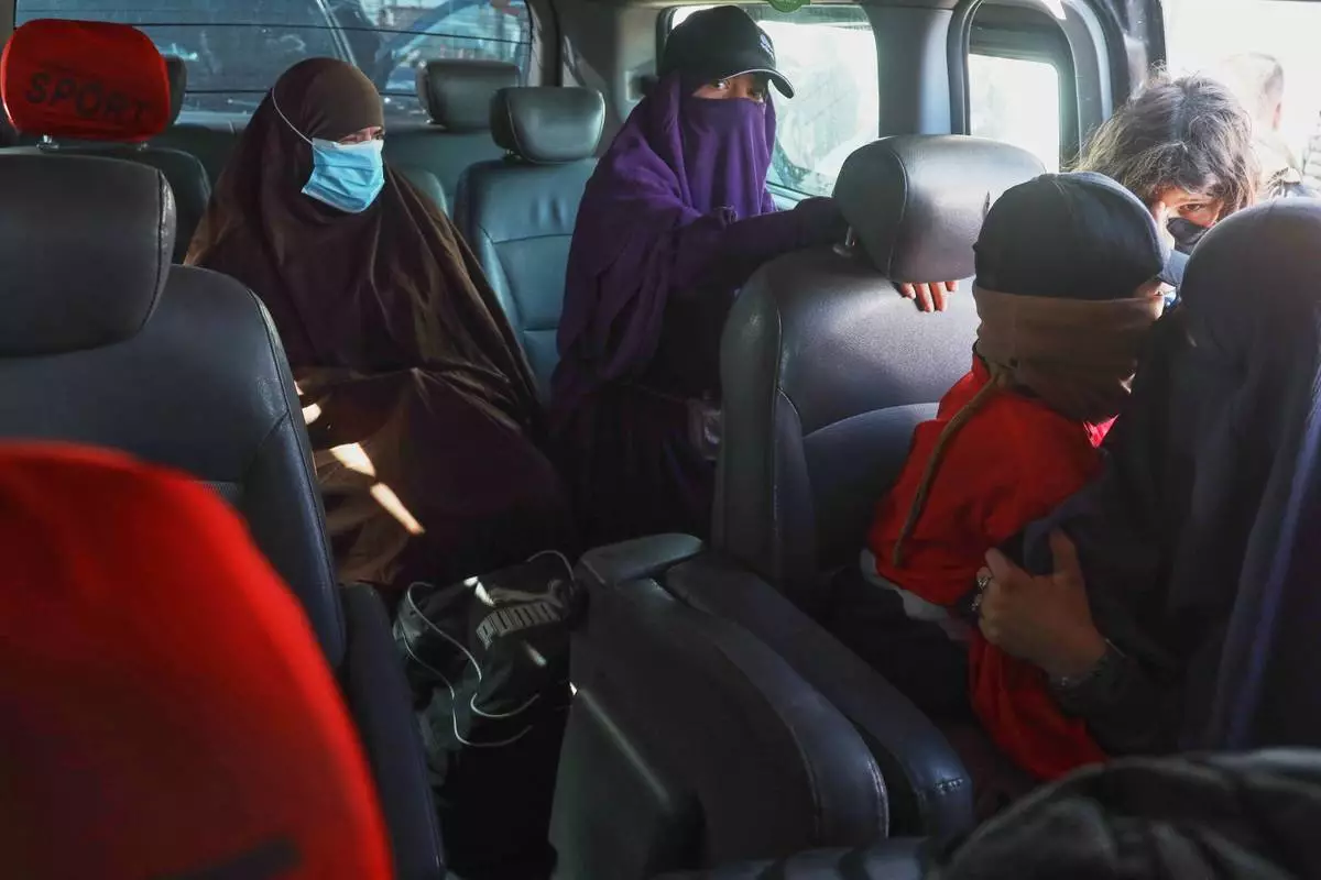 Family members of suspected Islamic State militants who are Australian nationals sit in a van heading to the airport in Damascus during the first repatriation operation of the year, at Roj Camp in eastern Syria, Monday, Feb. 16, 2026. Thirty-four Australian citizens from 11 families departed the camp. (AP Photo/Baderkhan Ahmad)