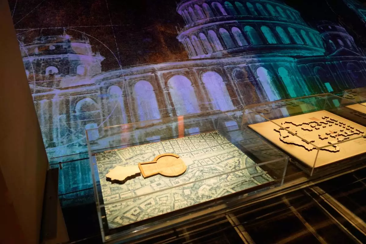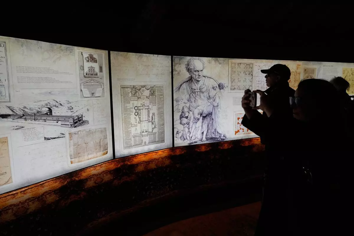 A rendering of St. Peter's Basilica is displayed during an exhibition titled "Ultra Visibilia" on the occasion of the 400th anniversary of the basilica's dedication at the Vatican, Monday, Feb. 16, 2026. (AP Photo/Gregorio Borgia)