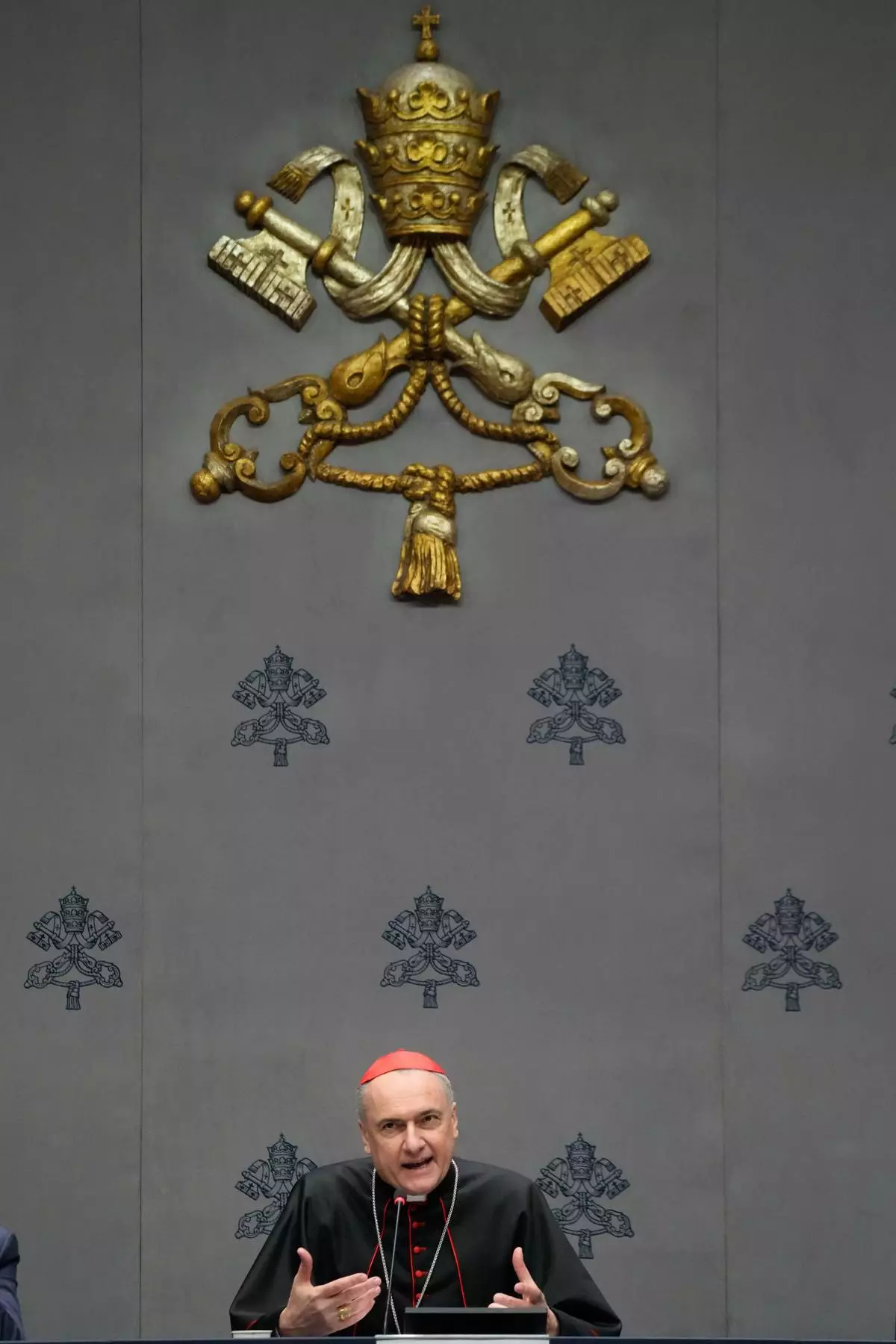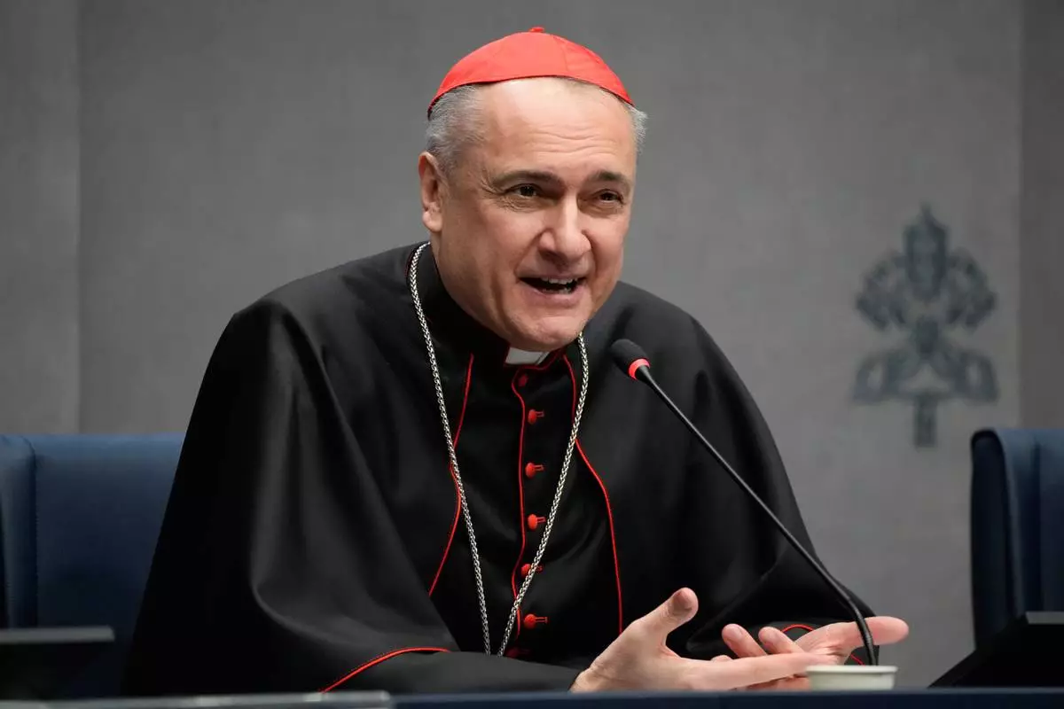 Cardinal Mauro Gambetti, Archpriest of the Papal Basilica of St. Peter and President of the Fabric of St. Peter, talks to journalists during a press conference presenting the Initiatives for the 400th anniversary of the dedication of St. Peter's Basilica at the Vatican, Monday, Feb. 16, 2026. (AP Photo/Gregorio Borgia)