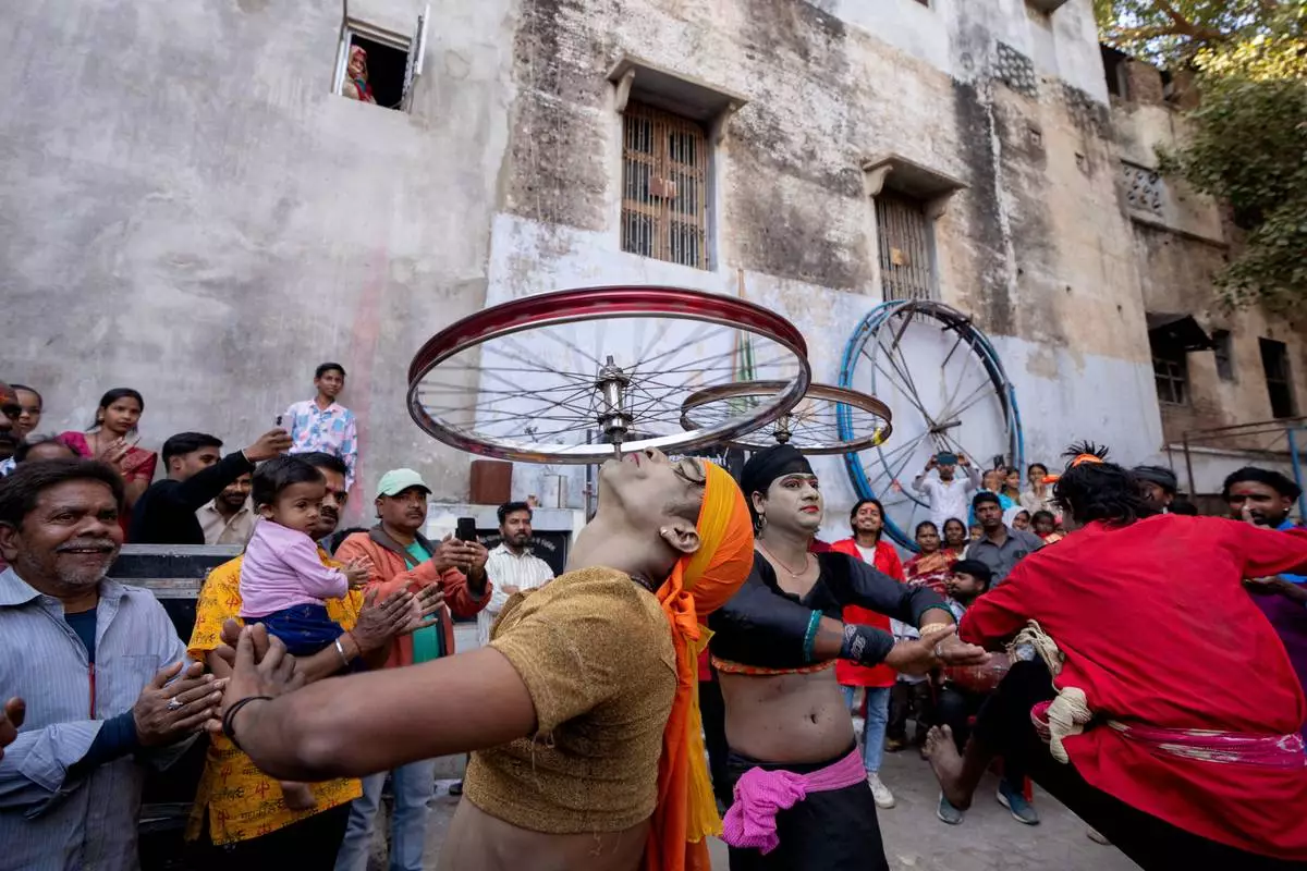 Artists dances during a procession on the occasion of Maha Shivaratri festival, as Hindus across the world celebrate Maha Shivratri, or the night of Shiva, observed on a moonless night annually and believed to be the day when Shiva got married, in Prayagraj, India, Sunday, Feb. 15, 2026. (AP Photo/Rajesh Kumar Singh)