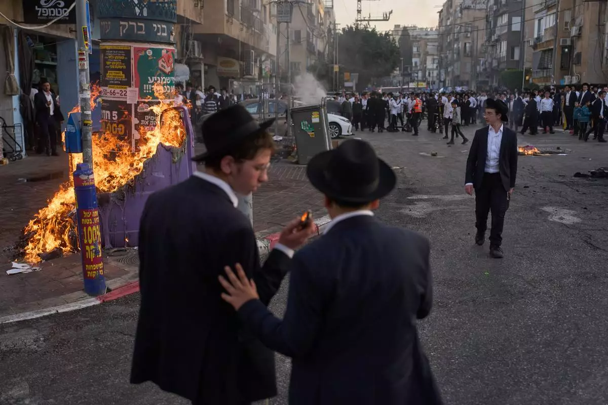 Ultra-Orthodox Jewish men burn trash during clashes with police after two female Israeli soldiers were rescued from riots that erupted during a welfare visit in Bnei Brak, Sunday, Feb. 15, 2026. (AP Photo/Oded Balilty)