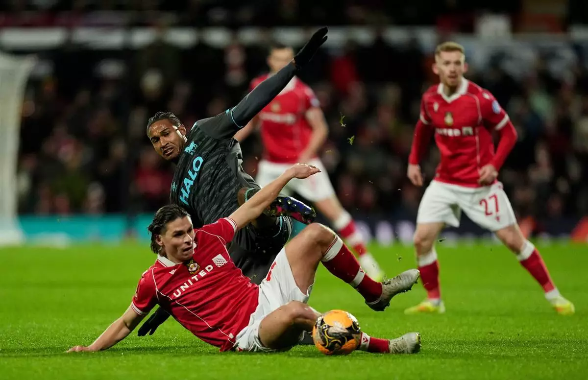Wrexham's George Dobson, bottom, and Ipswich Town's Jens Cajuste battle for the ball during an English FA Cup fourth round soccer, Friday, Feb. 13, 2026, in Wrexham, Wales. (Martin Rickett/PA via AP)