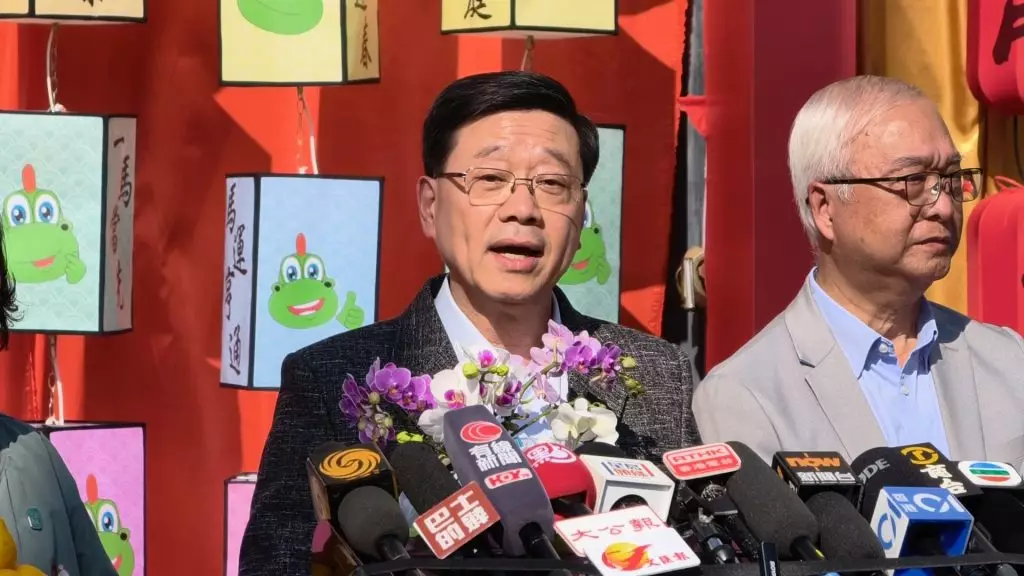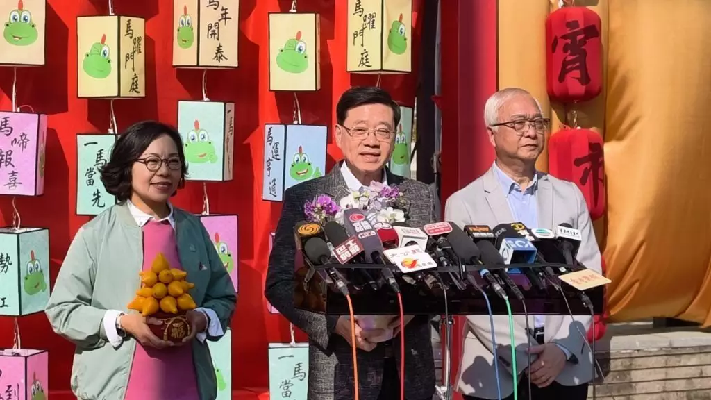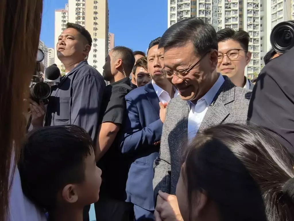 On February 16th, the Chinese New Year's Eve, the Chief Executive, Mr. John Lee, visited the Chinese New Year Fair at Kwun Tong Recreation Ground at around 3 p.m., accompanied by Miss Alice Mak, the Secretary for Home and Youth Affairs, and Mr. Tse Chin Wan, the Secretary for Environment and Ecology. They chatted with citizens and learning about the stalls' business.