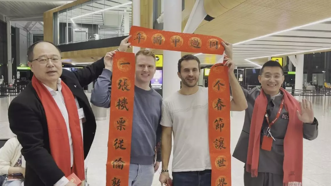 Passengers departing for China from London Heathrow Airport were immersed in a festive atmosphere on Sunday evening, as Terminal 2 was transformed into a celebration venue ahead of flights to the Chinese cities of Beijing and Shenzhen.