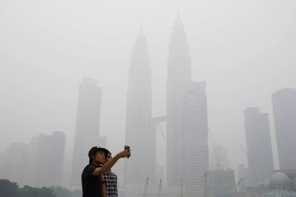 FILE -Tourists take a selfie against Malaysia's landmark building Petronas Twin Towers shrouded with haze in Kuala Lumpur, Malaysia on Sept. 26, 2015. (AP Photo/Joshua Paul, File)