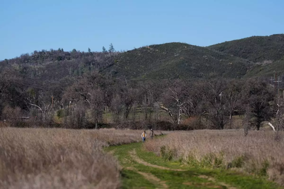 Lise Peterson, left, and Dan Antonaccio walk down a path while taking part in a California Lichen Society field trip at the University of California, Davis' McLaughlin Reserve in Lower Lake, Calif., Saturday, Jan. 24, 2026. (AP Photo/Jeff Chiu)