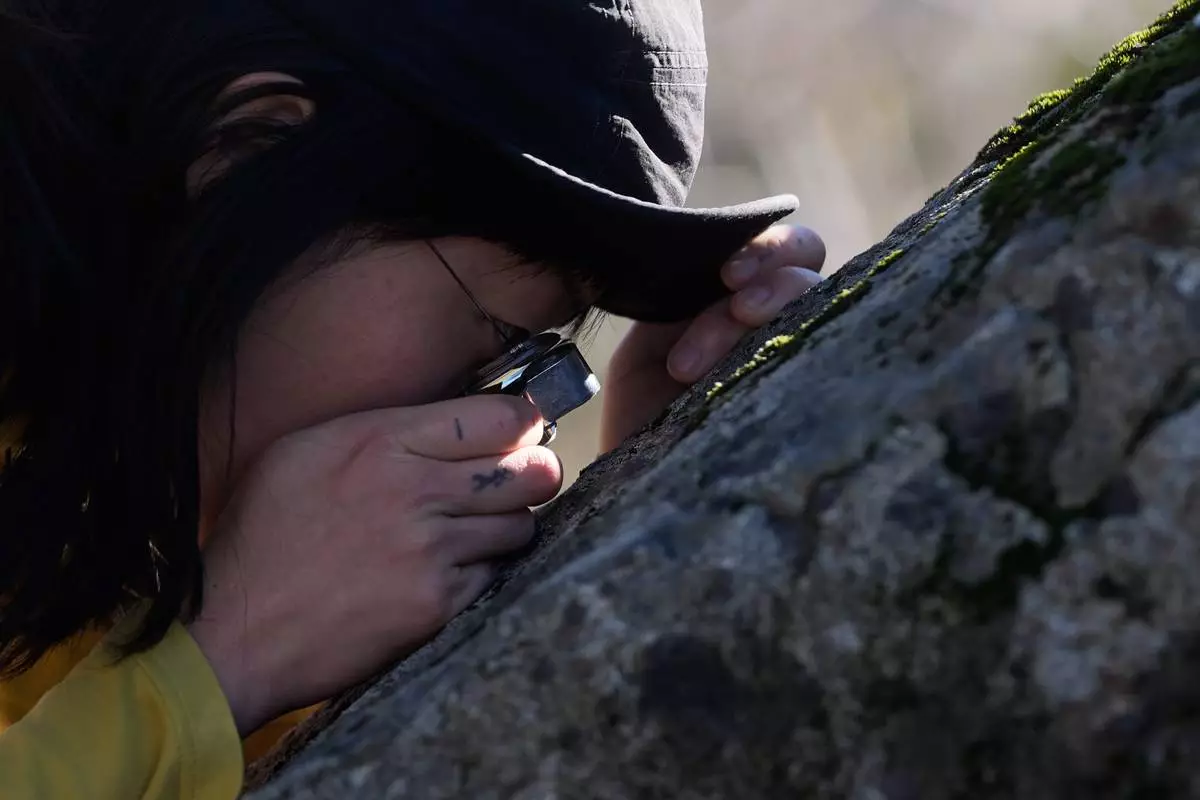 Gina Min, a member of the California Lichen Society, looks closely at lichen on a large rock during a CALS field trip at the University of California, Davis' McLaughlin Reserve in Lower Lake, Calif., Saturday, Jan. 24, 2026. (AP Photo/Jeff Chiu)