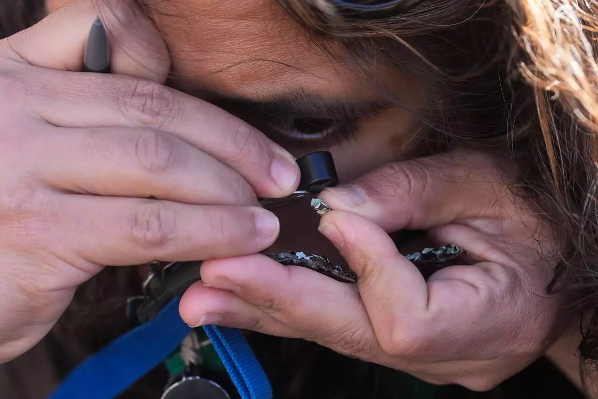 Laura Moreno-Baker, an ecologist with the Bureau of Land Management's Ukiah Field Office, looks at lichen through a hand lens loupe during a California Lichen Society field trip at the University of California, Davis' McLaughlin Reserve in Lower Lake, Calif., Saturday, Jan. 24, 2026. (AP Photo/Jeff Chiu)