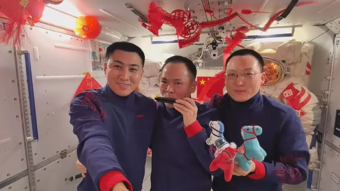In the beautifully decorated space station adorned with red lanterns, Chinese knots, and paper-cut crafts, the Shenzhou-21 trio presented a variety of performances. They played the mouth organ, engaged in clapper talk, and sang the song "The Five-Starred Red Flag Flies in Space," expressing their joy on the Chinese New Year's Eve. They concluded their show with a heartfelt poetry recitation.